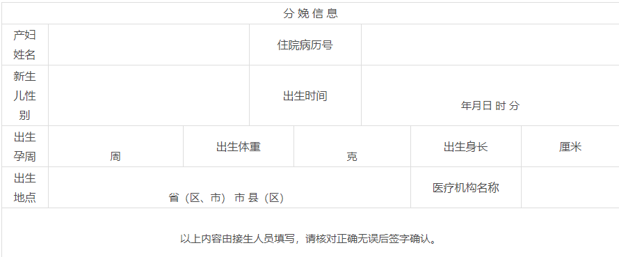 2.在具有助產(chǎn)技術(shù)服務(wù)資質(zhì)的醫(yī)療保健機(jī)構(gòu)內(nèi)出生的,“醫(yī)療機(jī)構(gòu)名稱”欄填寫該機(jī)構(gòu)名稱,其他情形填寫“∕”。